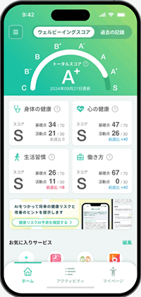 従業員の健康づくりを支援する、ウェルビーイングプラットフォーム。厳選された価値あるコンテンツが取り揃えられ、従業員の健康を支えている他、AIを用いたデータ管理・分析により法人の人的資本経営に向けた施策の立案・実行をサポートしています。