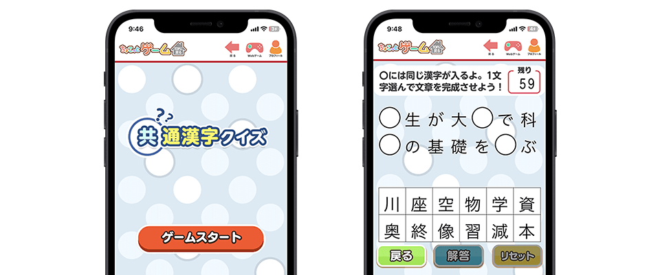 「共通漢字クイズ」は、文章中にある3~4カ所の空欄(白丸箇所)に共通する漢字1文字を、画面下部に表示される12個の選択肢の中から選び、当てはめて文章を完成させる脳トレゲームです。60秒の制限時間内であれば繰り返し挑戦可能で、1日1問、365日毎日お楽しみいただけます。